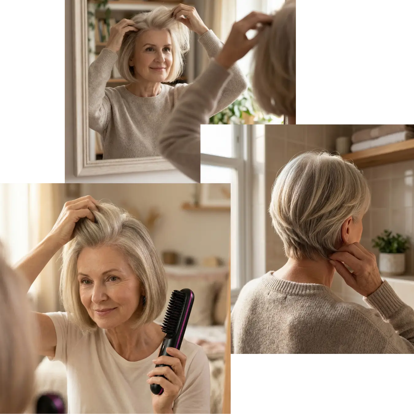 Ma mère a toujours porté les cheveux courts. Avec le temps, ses cheveux sont devenus plus fins, plus sensibles à l’humidité, avec des petits épis plus difficiles à dompter, surtout à l’arrière de la tête.